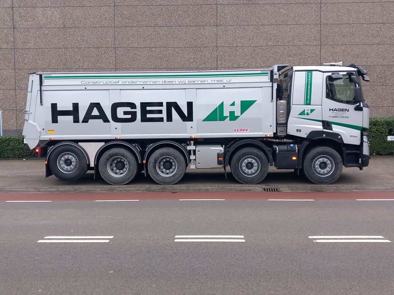 Hagen Groep, met vestigingen in Weesp en Almere, heeft als eerste in Nederland een volledig af-fabriek gebouwde 10x4 Renault Trucks kipper in gebruik genomen. Deze compacte 5-asser, met een GVW van 47 ton en een laadvermogen van 30 ton, is voorzien van een hefbare, gestuurde achteras. Daardoor ontstaat een zeer wendbaar en compact voertuig, ideaal voor inzet in de drukke Randstad-regio.