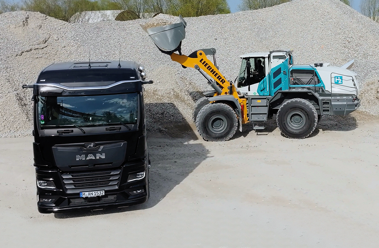 De inzet bij de grindverwerkingsinstallatie toont op indrukwekkende wijze aan dat waterstofaandrijvingen in geen enkel opzicht onderdoen voor dieselmotoren. De Liebherr L 566 H – het eerste prototype van een grote wiellader uitgerust met een Liebherr-waterstofmotor – werkt samen met de inmiddels productierijpe MAN hTGX-truck en een ontwikkelingsvoertuig gebaseerd op een Mercedes-Benz Arocs van Daimler Truck. Alle drie de machines hebben veeleisende grondverzet- en materiaalverwerkingstaken succesvol en betrouwbaar uitgevoerd, met lage emissies.