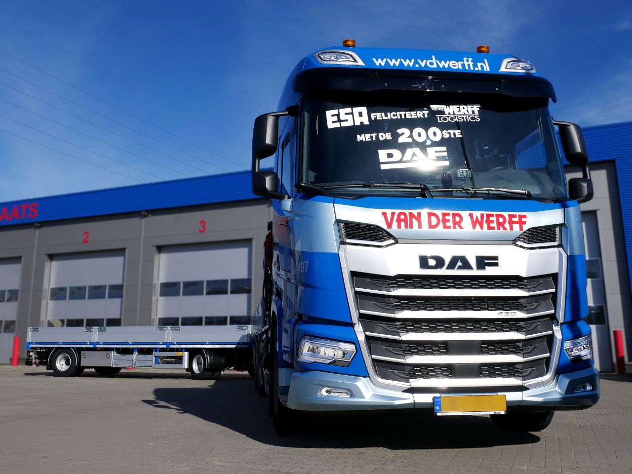 DAF-dealer ESA Trucks heeft onlangs voor een mijlpaal gezorgd. De dealer heeft de 200ste DAF afgeleverd bij Van der Werff Logistics, een DAF XF 430 FAN met Sleeper High Cab. Comfort en veiligheid stonden bij de aanschaf van de nieuwe truck centraal. Zo is het jubileummodel uitgerust met LED-koplampen en mistlampen, LED Skylights, zes werklampen, flitsers aan de voor- en achterzijde en twee zwaailampen op het dak.