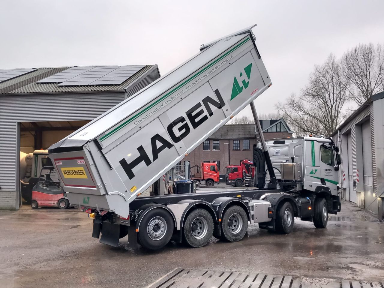 Hagen Groep, met vestigingen in Weesp en Almere, heeft als eerste in Nederland een volledig af-fabriek gebouwde 10x4 Renault Trucks kipper in gebruik genomen. Deze compacte 5-asser, met een GVW van 47 ton en een laadvermogen van 30 ton, is voorzien van een hefbare, gestuurde achteras. Daardoor ontstaat een zeer wendbaar en compact voertuig, ideaal voor inzet in de drukke Randstad-regio.